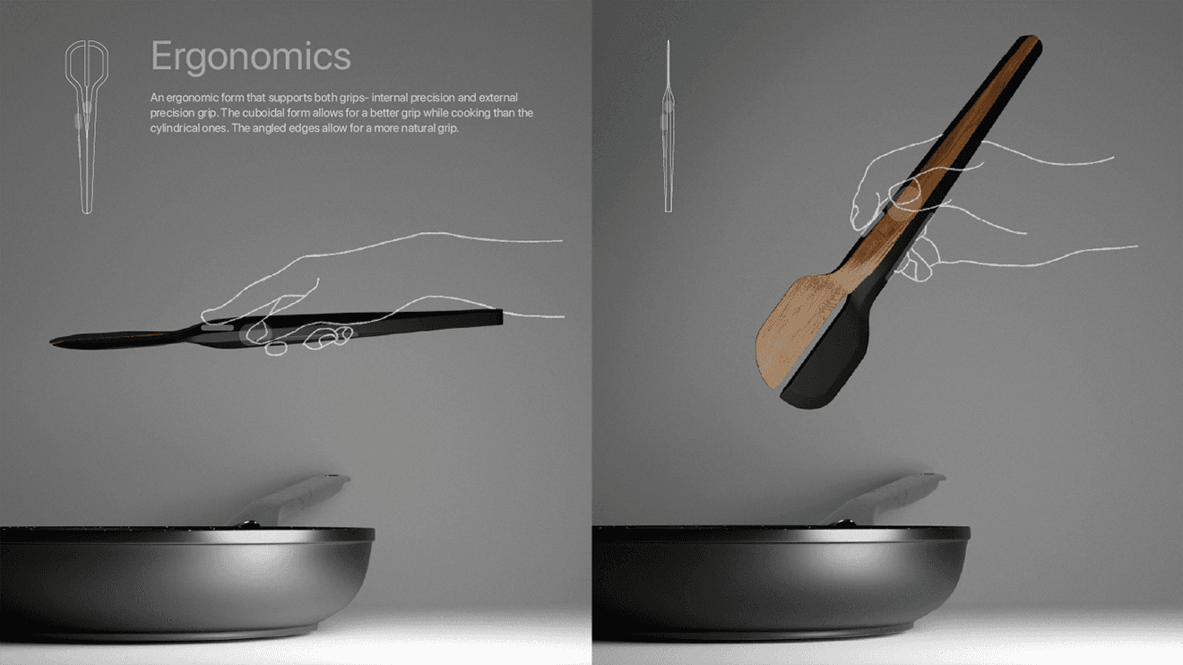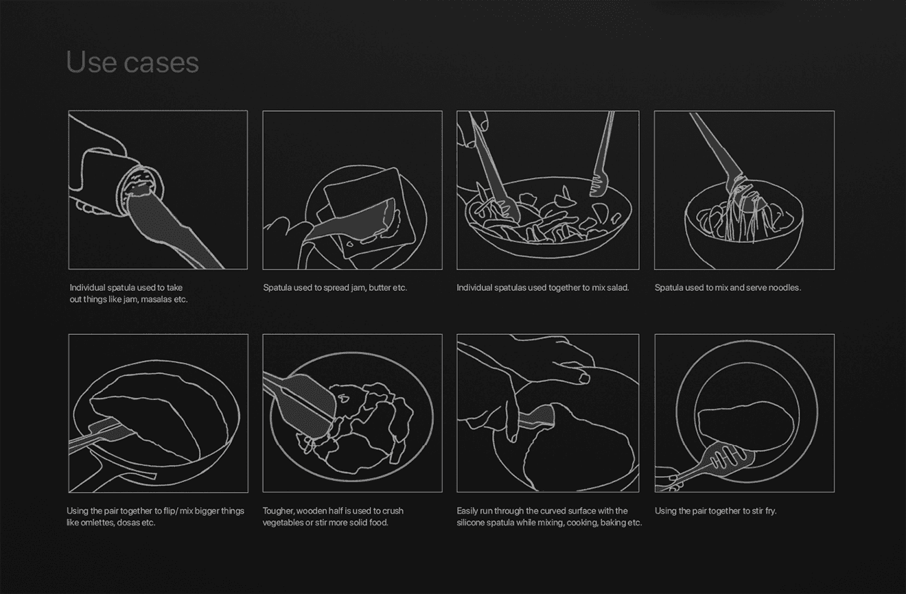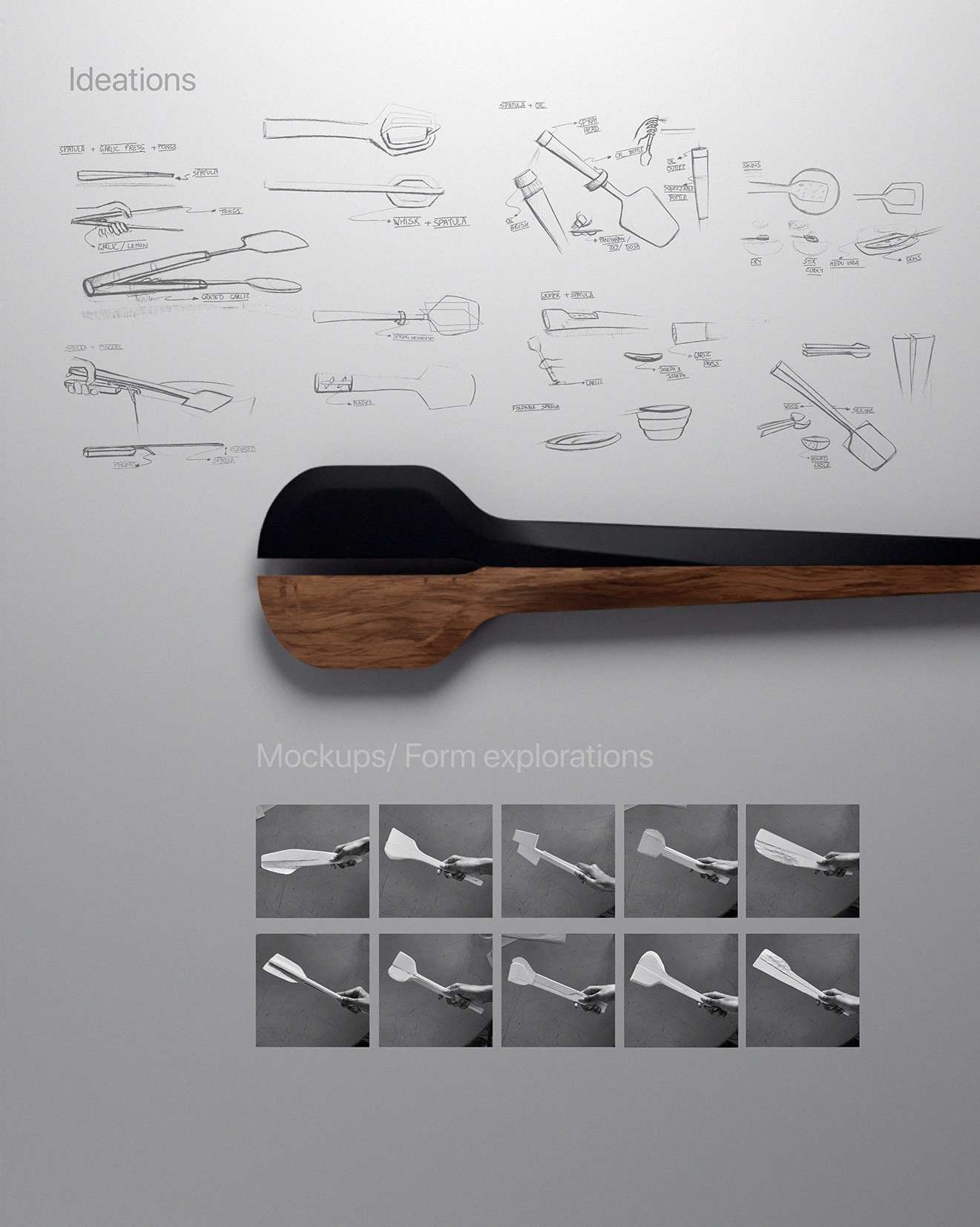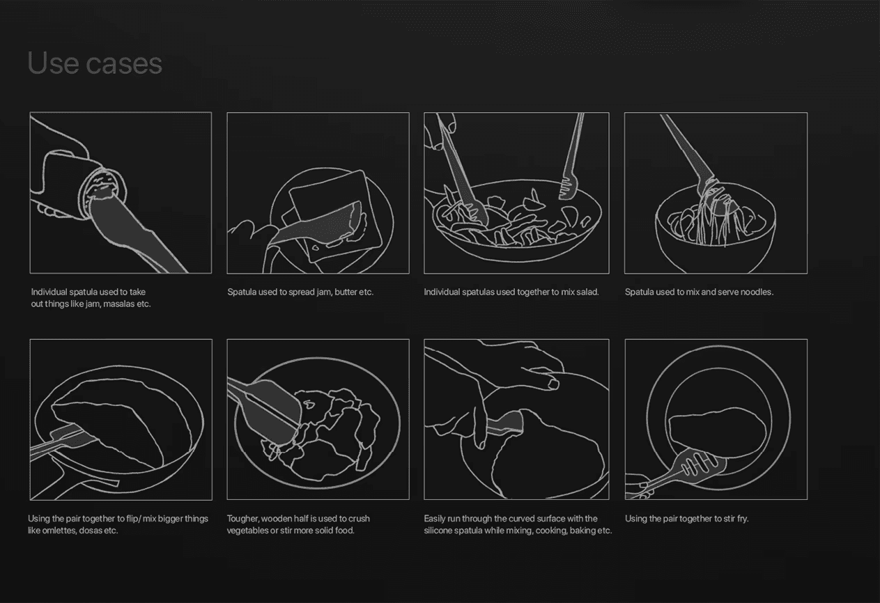 The primary research gave us good insights into the potential interventions out of which Spatula as a tool was found to be widely used and had great potential of intervention. Based on the collected data regarding the problems, the usage and the expectiations of the user, further ideation and prototyping were done for a reimagined spatula.